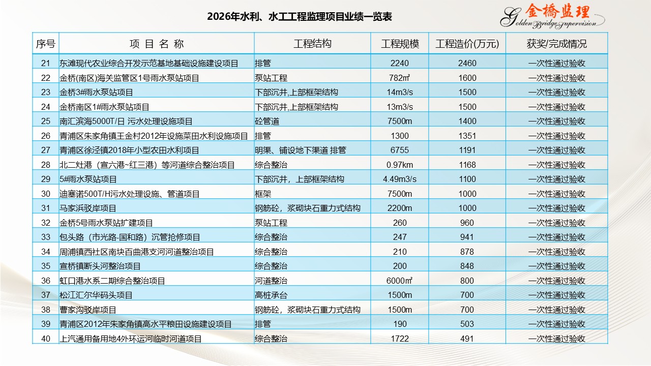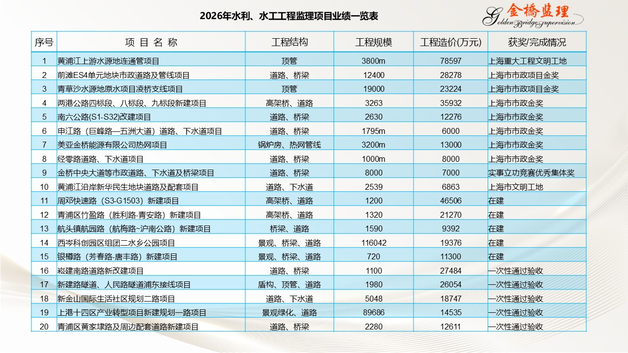 部分水利工程监理项目业绩一览表